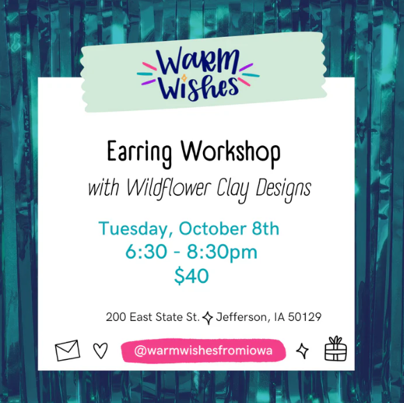 Join Marie from Wildflower Clay Designs for this make-your-own earring workshop. You will learn the basics of working with polymer clay. Choose between different design and color options to create your own pair of custom earrings. You’ll have the option between making one pair of dangle or two pairs of stud earrings.