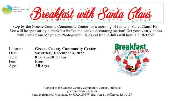 Stop by the Greene County Community Center for a morning of fun with Santa Claus! Hy-Vee will be sponsoring a breakfast buffet and cookie decorating station! Get your yearly photo with Santa from Meythaler Photography! Kids eat free, adults will have a buffet fee. Register at the Rec Center or online at gccc.activityreg.com
