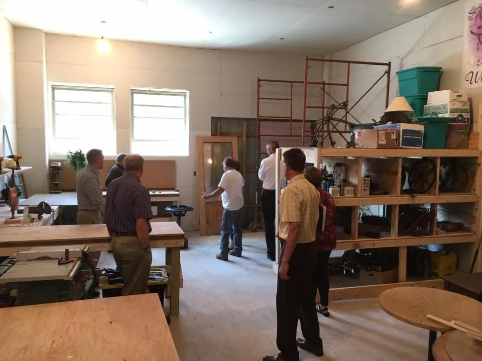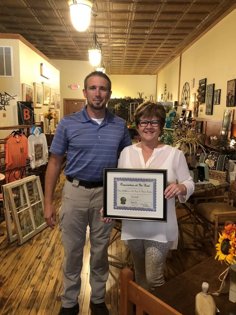 In 2015, the Kendall Building was run-down and abandoned. The City of Jefferson purchased the building for $50 and made a commitment of $150,000 to renovate the building. Rosie & Ray Tucker moved back to Jefferson and were interested in opening their business from Arkansas, Sensibly Chic, in the Kendall building . Rosie is the granddaughter of the original Kendall family. A Challenge Grant was awarded in 2016 for the total restoration with retail in the first level and the Tucker’s apartment in the 2nd story. This took collaboration of the Tuckers, City, and Jefferson Matters: Main Street with assistance from the school’s athletic dept. for debris removal from the basement.