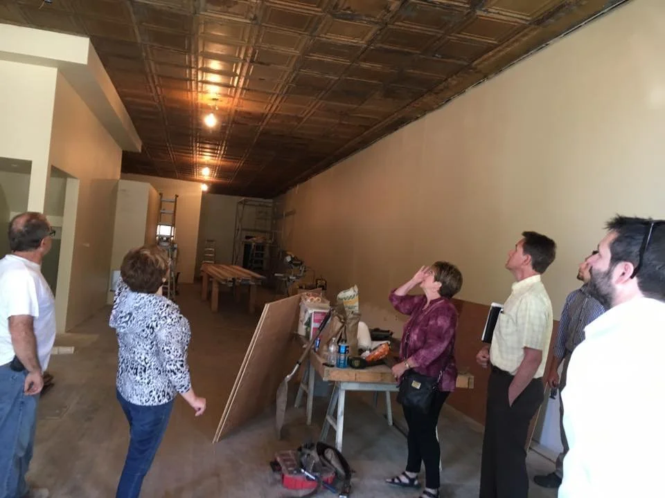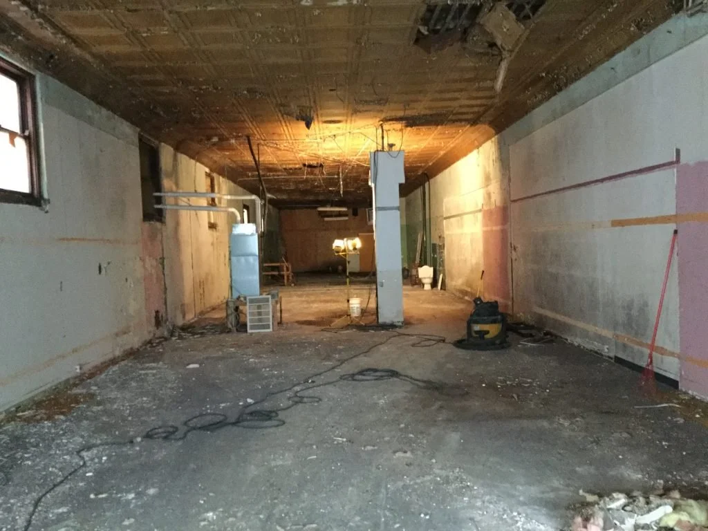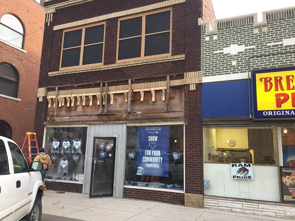 From demolition and stripping down of the entire building, asbestos removal, a new roof, and stabilization of the basement by the City to refinishing the original billiard hall floors, brick-pointing, restoring the original metal ceiling, and building new stairs to the 2nd floor. The new storefront windows showcased home décor, and upper-story windows were inserted into the plywood openings. Local contractors were used throughout the project.
