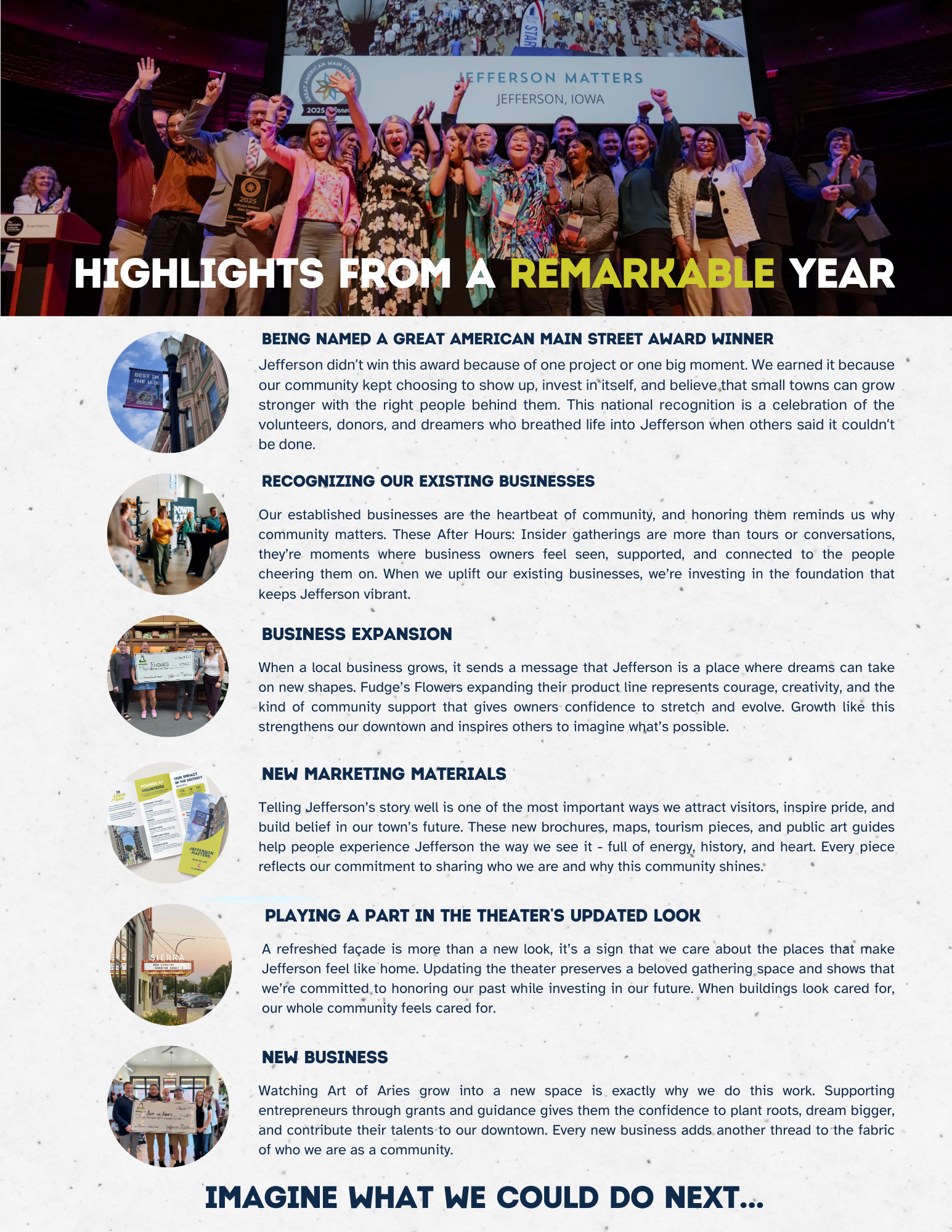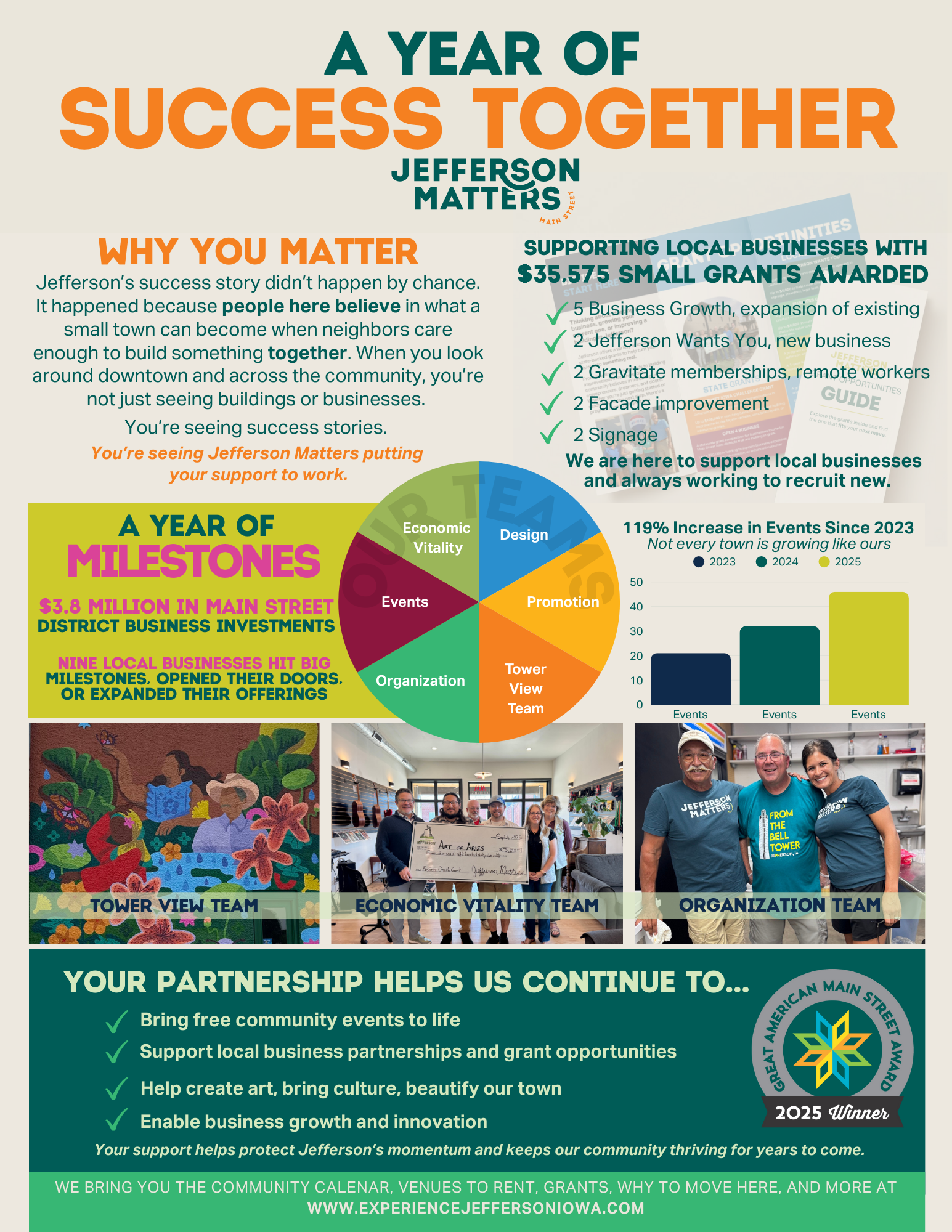 Join us for a fun, feel-good night that supports Jefferson Matters and the behind-the-scenes work that keeps Jefferson moving forward. From growing economic vitality to celebrating local art, culture, and the businesses that call our community home, this event is a chance to connect, give back, and enjoy a great night with friends and neighbors.