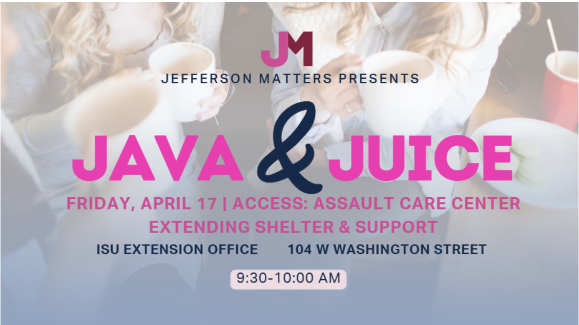 Join us for Java and Juice at the Iowa State Extension Office, hosted by ACCESS: Assault Care Center Extending Shelter and Support.